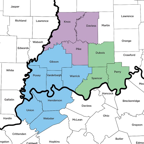 Indiana - Daviess, Dubois, Gibson, Knox, Perry, Pike, Posey, Spencer, Vanderburgh, and Warrick